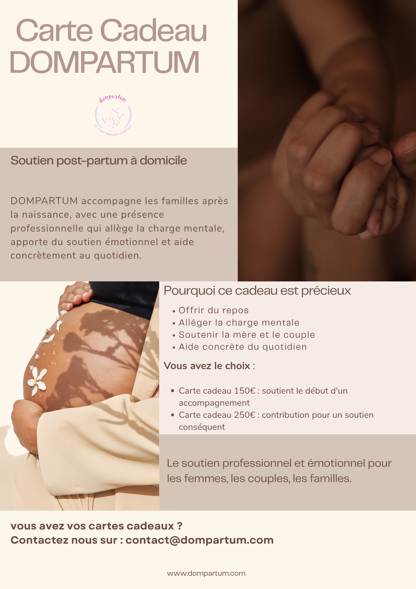 de la préparation pendant la grossesse à l’accompagnement après la naissance, pour les femmes, les couples et les familles. Et si on arrêtait de recevoir des dizaines de doudous à la naissance de son enfant ? On prépare beaucoup l’arrivée du bébé. Beaucoup moins le retour à la maison. DOMPARTUM permet d’intégrer un accompagnement post-partum directement à votre liste de naissance. Anticipez pour mieux profiter. Le matériel est utile, mais le soutien humain est essentiel pour garder le contrôle de votre retour à la maison. Offrez-vous une structure solide qui gère l’organisationnel et la logistique à votre place. C’est le cadeau commun idéal pour permettre à vos proches d’agir concrètement sur vos… C’est simple et rapide. Téléchargez le document à ajouter à votre liste pour expliquer l’accompagnement à vos proches. Ajoutez vos liens pour une carte cadeau de 150 € et/ou 250 €. Les deux montants peuvent être cumulés, dans la limite d’une carte de chaque par foyer. Créez un nouveau souhait et personnalisez son titre. Ajoutez la fiche téléchargée en image d’illustration, puis copiez-collez votre ou vos liens de paiement. Lorsqu’un proche participe, vous recevez votre carte cadeau et pouvez l’utiliser librement. Veuillez noter que l’achat de cartes cadeaux n’est pas éligible au crédit d’impôt. Ce dernier s’applique exclusivement aux prestations de soutien à domicile réalisées après la naissance. Vivez cette transition avec assurance. Un foyer qui tourne et une charge mentale allégée pour rester concentrée sur l’essentiel Un espace de partage exclusif et sans jugement pour valider vos choix de parents en toute sérénité La garantie de ne pas subir l’épuisement et de protéger de couple. DOMPARTUM vous accompagne pour comprendre et vivre sereinement l’après accouchement